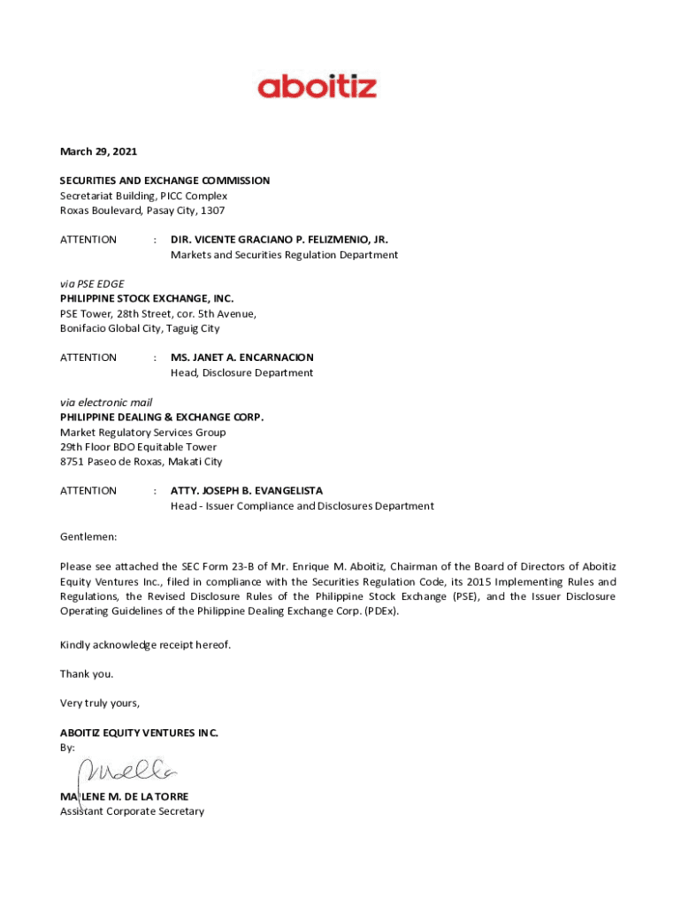 March 29, 2021, SECURITIES AND EXCHANGE COMMISSION Secretariat Building, PICC Complex Rojas Boulevard, Pasty City, 1307 ATTENTION:DIR. VICENTE GRACIANO P. FELIZMENIO, JR. Markets and Securities Regulation