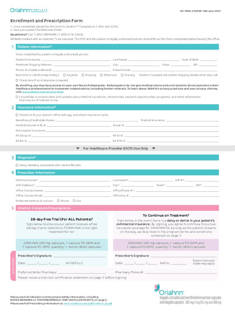 USORIA210048 February 2021Enrollment and Prescription Form 1. Once completed, please fax this form to OriahnnTM Complete at 18556625355. 2. Give your patient the Welcome Sheet. Questions? Call 1800ORIAHNN