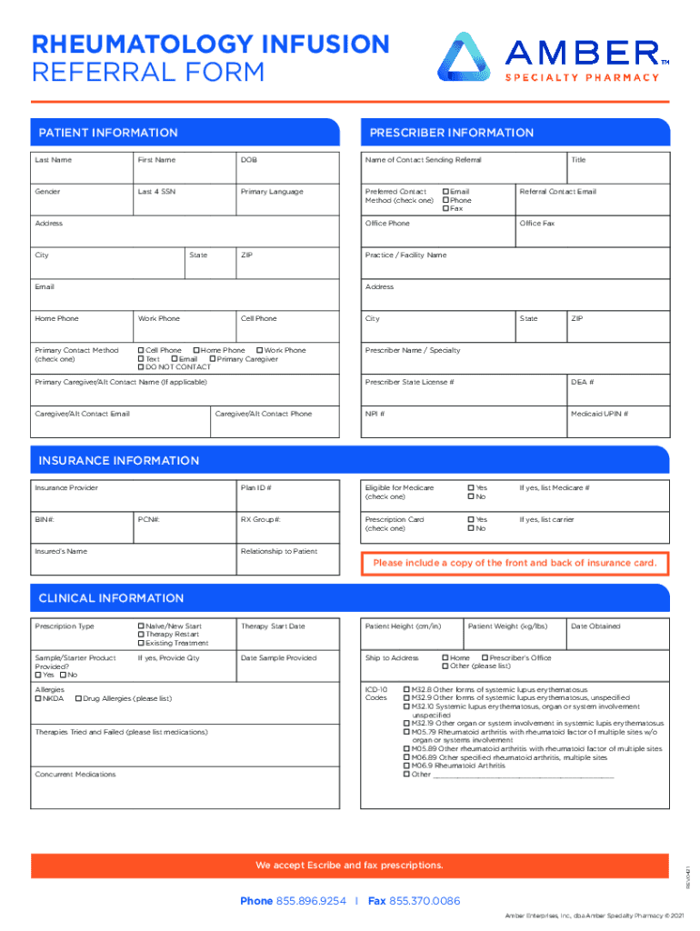 RHEUMATOLOGY INFUSION REFERRAL FORM PATIENT INFORMATIONPRESCRIBER Informational NameFirst NameDOBName of Contact Sending ReferralGenderLast 4 Primary LanguagePreferred Contact Method (check one)AddressEmail