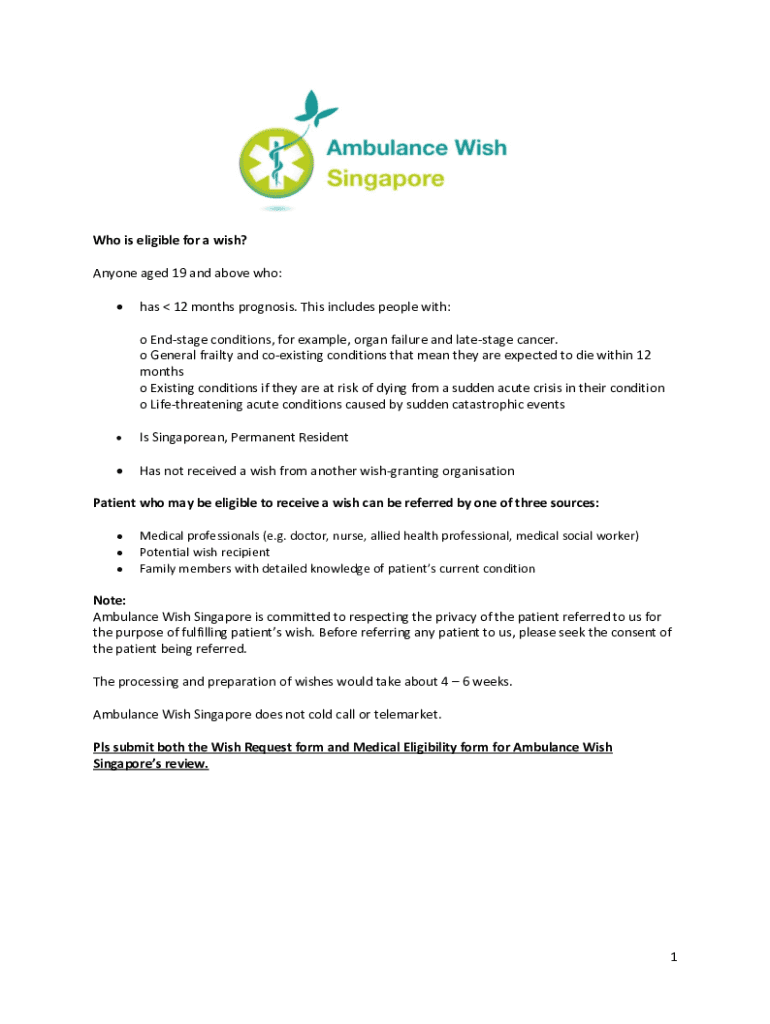 Who is eligible for a wish? Anyone aged 19 and above whom: has 12 months prognosis. This includes people with: o End stage conditions, for example, organ failure and late stage cancer. O General frailty
