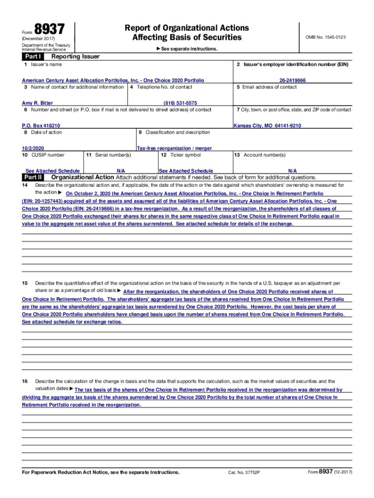 8937Report of Organizational Actions Affecting Basis of SecuritiesForm (December 2017) Department of the Treasury Internal Revenue Serviceman I See OMB No. 15450123separate instructions. Reporting