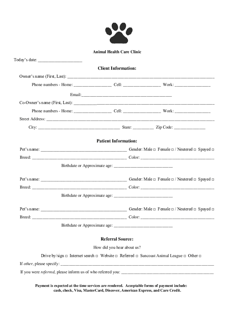 Animal Health Care Clinic Today's date: Client Information: Owners name (First, Last): Phone numbers Home: Cell: Work: Email: Owners name (First, Last): Phone numbers Home: Cell: Work: Street Address: