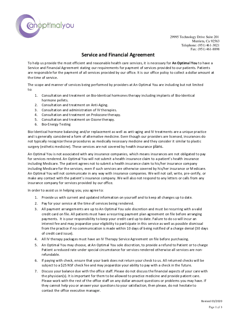 29995 Technology Drive Suite 201 Murrieta, Ca 92563 Telephone: (951) 4613021 Fax: (951) 4618898Service and Financial Agreement To help us provide the most efficient and reasonable health care services,