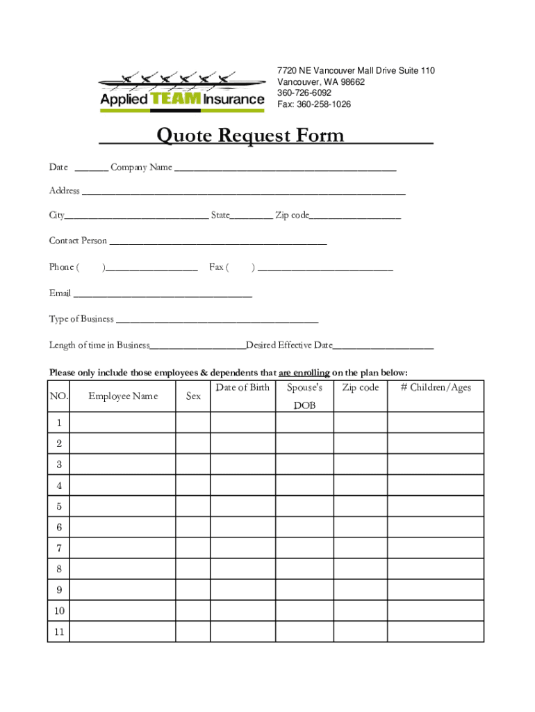7720 NE Vancouver Mall Drive Suite 110 Vancouver, WA 98662 3607266092 Fax: 3602581026Quote Request Form Date Company Name Address City State Zip code Contact Person Phone () Fax () Email Type of Business