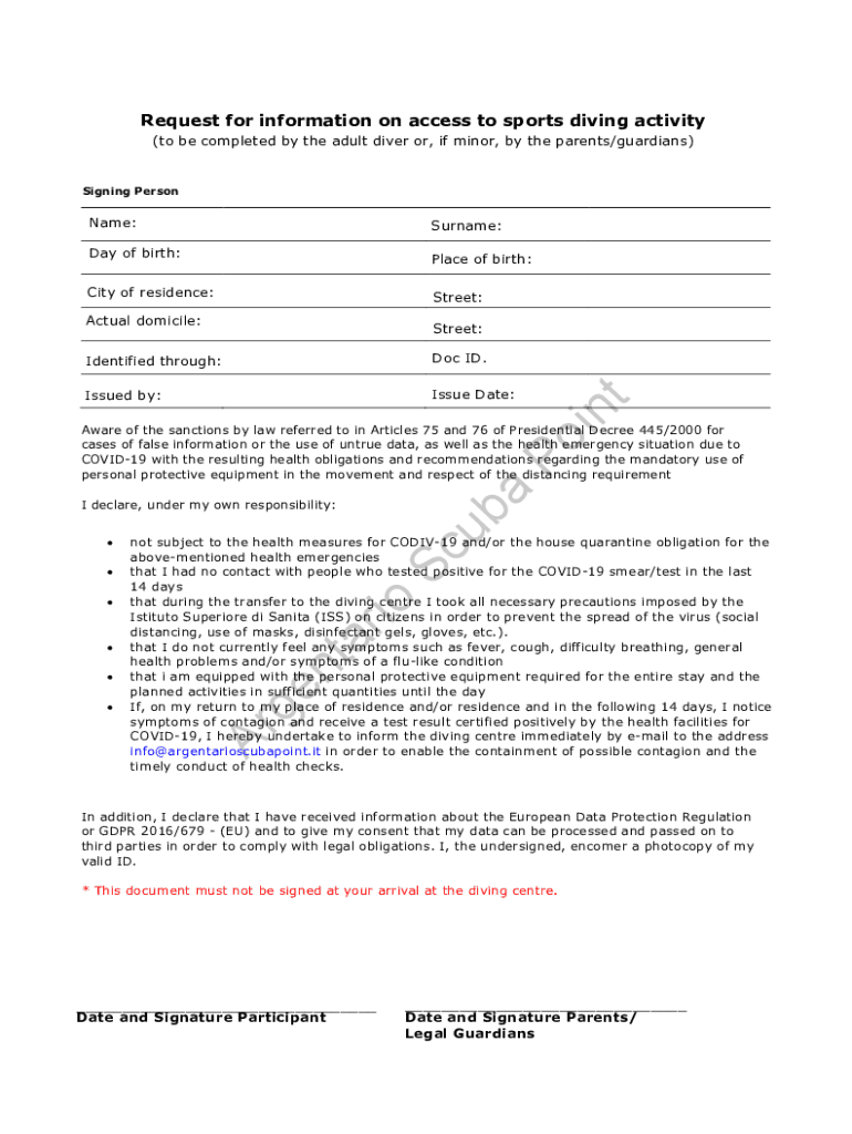 Request for information on access to sports diving activity (to be completed by the adult diver or, if minor, by the parents/guardians)Signing Personae:Surname:Day of birth:Place of birth:City of
