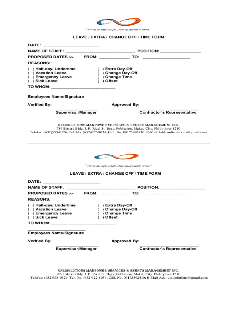 Hiring the right peopleManaging quality events! LEAVE / EXTRA / CHANGE OFF / TIME FORM DATE: NAME OF STAFF: POSITION: PROPOSED DATES FROM: TO: REASONS: (((() Halfway/ Under time) Vacation Leave) Emergency