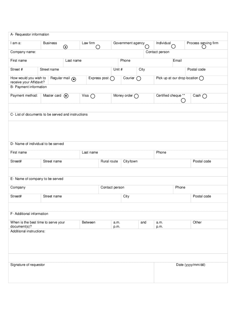 A Requestor information I am a:Businessman misgovernment agencyIndividualProcess serving firmCompany name:Contact personifies name Street #Last name Street somehow would you wish to receive your Affidavit?