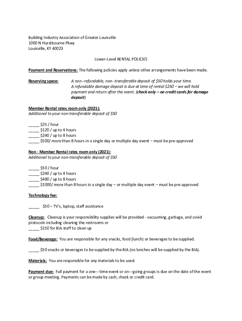 Building Industry Association of Greater Louisville 1000 N Hurstbourne Pkwy Louisville, KY 40023 LowerLevel RENTAL POLICIES Payment and Reservations: The following policies apply unless other arrangements