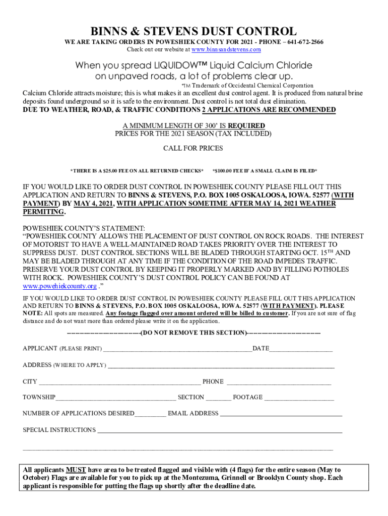 BINDS & STEVENS DUST CONTROL ARE TAKING ORDERS IN POWESHIEK COUNTY FOR 2021 PHONE 6416722566 Check out our website at www.binnsandstevens.comWhen you spread LIQUID Calcium Chloride on unpaved roads,