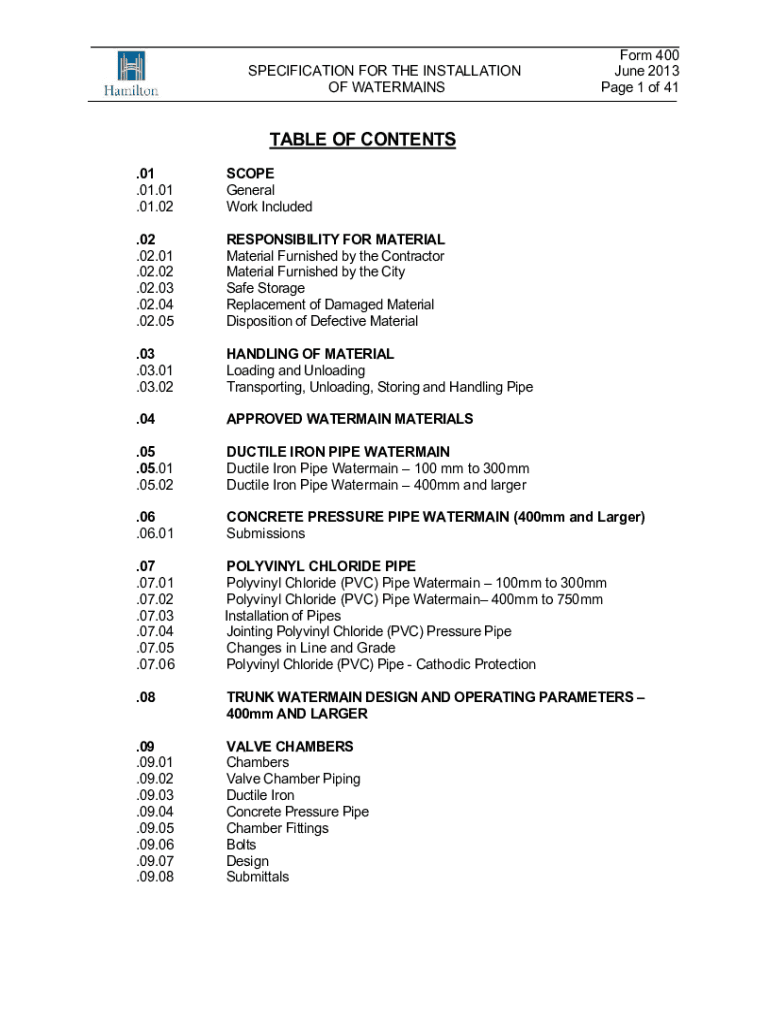 SPECIFICATION FOR THE INSTALLATION OF WATERMAINSForm 400 June 2013-Page 1 of 41TABLE OF CONTENTS .01 .01.01 .01.02SCOPE General Work Included.02 .02.01 .02.02 .02.03 .02.04 .02.05RESPONSIBILITY FOR