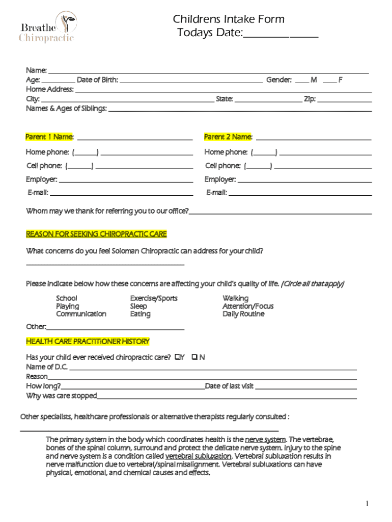 Children's Intake Form Today's Date: Name: Age: Date of Birth: Home Address: City: Names & Ages of Siblings:Gender: State:Parent 1 Name:Flip:Parent 2 Name:Home phone: (Cell phone: (M)Home phone: ()Cell