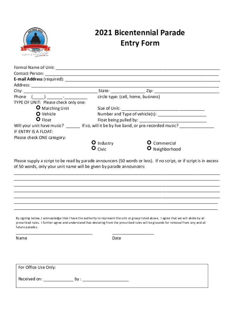 2021 Cyrus Bicentennial PARADE APPLICATION Becky Lutz Parade CoChairpersonSaturday July 3, 2021 6:00 p.m. Ronda Rowland Parade CoChairperson2021 Theme: Celebrating Cyrus Bicentennial! Parade Rules: