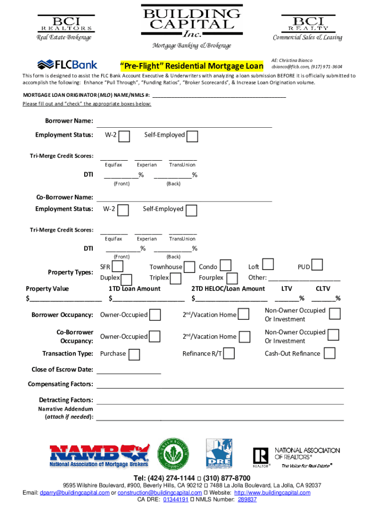 Real Estate BrokerageCommercial Sales & LeasingMortgage Banking & Brokerage AE: Christina Bianca flcb.com, (917) 9713604PreFlight Residential Mortgage Loathes form is designed to assist the FLY Bank