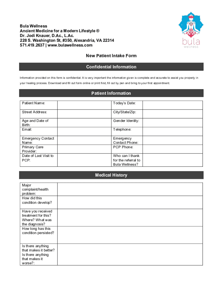 Bulk Wellness Ancient Medicine for a Modern Lifestyle Dr. Jodi Bauer, D. Ac., L. Ac. 228 S. Washington St, #350, Alexandria, VA 22314 571.419.2637 www.bulawellness.comNew Patient Intake Form Confidential