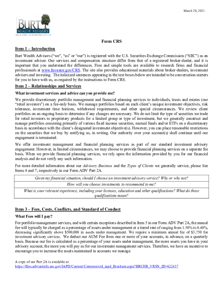 March 29, 2021Form CRS Item 1 Introduction Burt Wealth Advisors (we, us or our) is registered with the U.S. Securities Exchange Commission (SEC) as an investment advisor. Our services and compensation