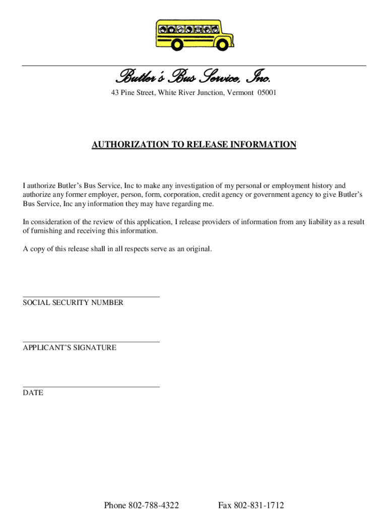 Butlers Bus Service, Inc. 43 Pine Street, White River Junction, Vermont 05001AUTHORIZATION TO RELEASE INFORMATION authorize Butlers Bus Service, Inc to make any investigation of my personal or employment