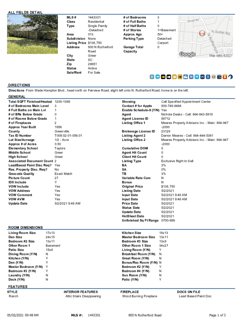 ALL FIELDS DETAIL MLS # Class Type1443301 Residential Single Family Detached Area 013 Subdivision None Listing Price $138,750 Address 800 N Rutherford Road City Greer State SC Zip 29651 Status Active