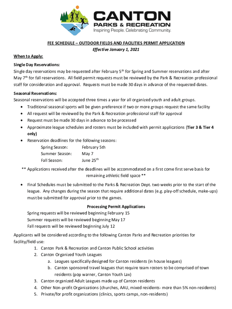 FEE SCHEDULE OUTDOOR FIELDS AND FACILITIES PERMIT APPLICATION Effective January 1, 2021, When to Apply: Single Day Reservations: Single day reservations may be requested after February 5th for Spring