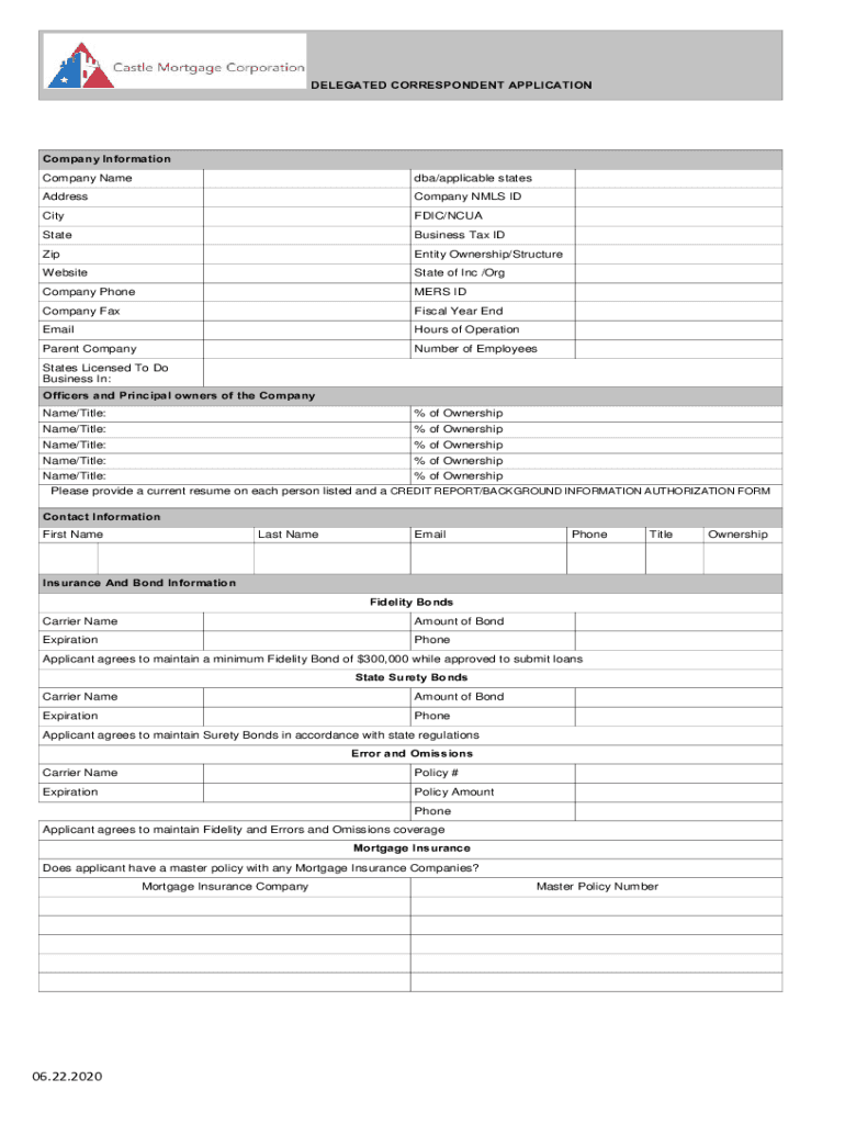 DELEGATED CORRESPONDENT APPLICATIONCompany Information Company Named/applicable statesAddressCompany NLS IDCityFDIC/NCUAStateBusiness Tax Identity Ownership/StructureWebsiteState of Inc /Company Phonemes