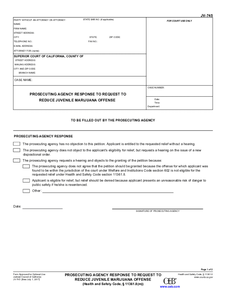 Get the free jv-745 prosecuting agency response to request to reduce juvenile marijuana offense (...