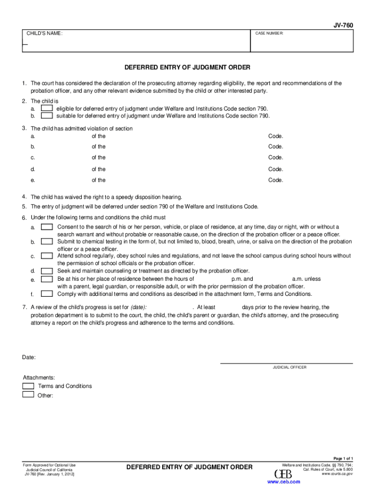 Change Document Font Recheck SpellingEmail Form Save FormJV760 CHILD IS NAME:CASE NUMBER:+DEFERRED ENTRY OF JUDGMENT ORDER 1. The court has considered the declaration of the prosecuting attorney regarding