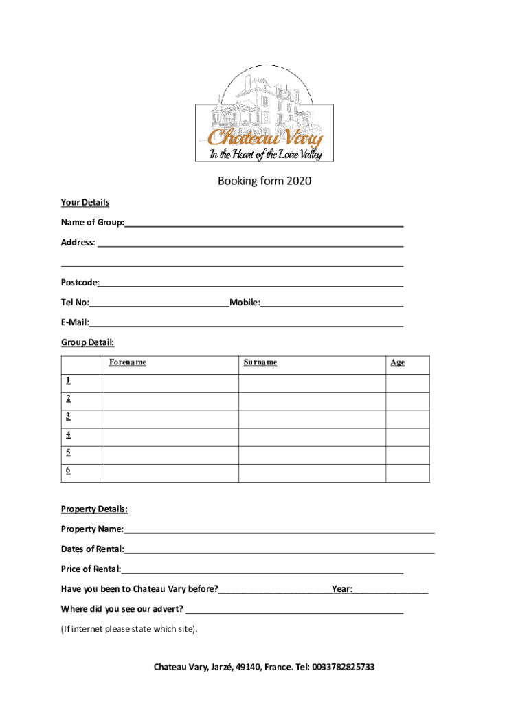 Booking form 2020 Your Details Name of Group: Address:Postcode: Tel No:Mobile:Email: Group Detail: ForenameSurnameAge1 2 3 4 5 6Property Details: Property Name: Dates of Rental: Price of Rental: Have