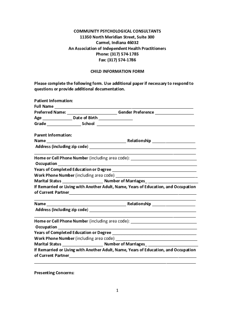 COMMUNITY PSYCHOLOGICAL CONSULTANTS 11350 North Meridian Street, Suite 300 Carmel, Indiana 46032 An Association of Independent Health Practitioners Phone: (317) 5741785 Fax: (317) 5741786 CHILD INFORMATION