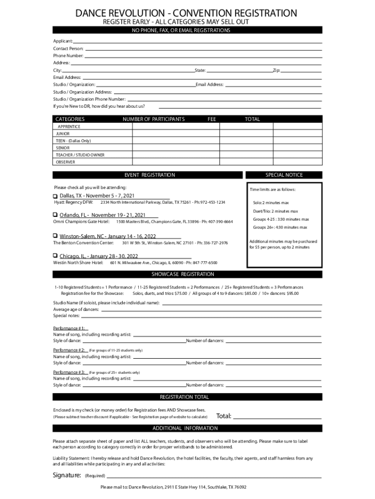 DANCE REVOLUTION CONVENTION REGISTRATION REGISTER EARLY ALL CATEGORIES MAY SELL OUT NO PHONE, FAX, OR EMAIL REGISTRATIONS Applicant: Contact Person: Phone Number: Address: City:State:Zip:Email Address: