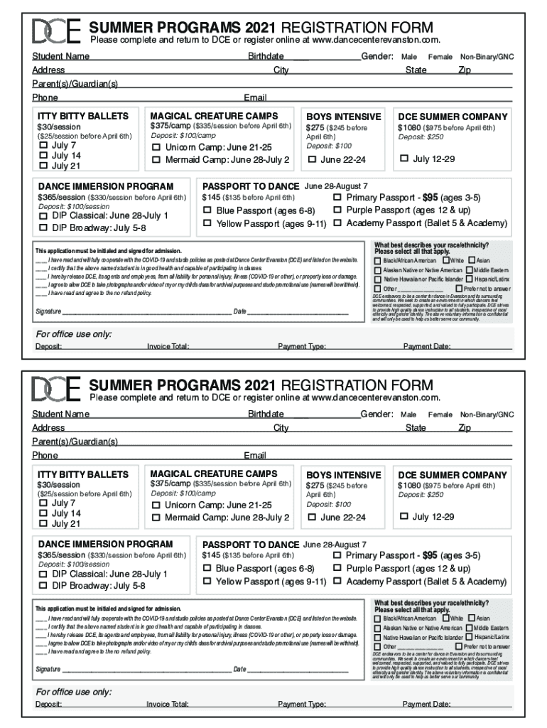 SUMMER PROGRAMS 2021 REGISTRATION Formulas complete and return to DCE or register online at www.dancecenterevanston.com. Student Name Address Parent(s)/Guardian(s) PhoneBirthdate Cisgender:MAGICAL