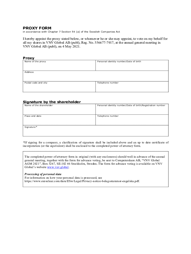 PROXY FORM in accordance with Chapter 7, Section 54 (a) of the Swedish Companies Act hereby appoint the proxy stated below, or whomever he or she may appoint, to vote on my behalf for all my shares