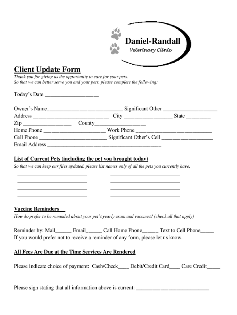 Daniel Randall Veterinary ClinicClient Update Form Thank you for giving us the opportunity to care for your pets. So that we can better serve you and your pets, please complete the following:Today's