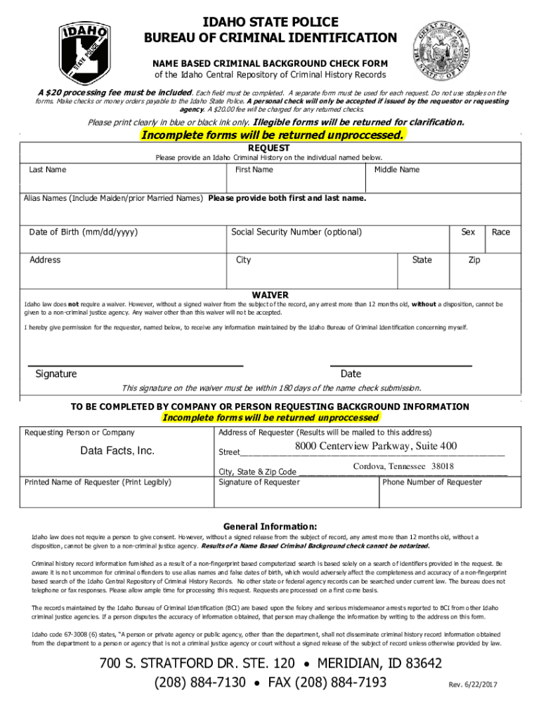 IDAHO STATE POLICE BUREAU OF CRIMINAL IDENTIFICATION NAME BASED CRIMINAL BACKGROUND CHECK FORM of the Idaho Central Repository of Criminal History Records A $20 processing fee must be included. Each