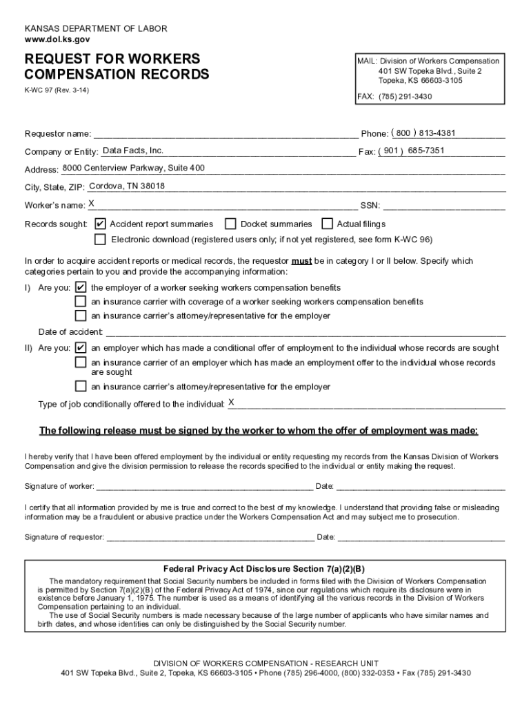 KANSAS DEPARTMENT OF LABOR www.dol.ks.govREQUEST FOR WORKERS COMPENSATION RECORDSMAIL: Division of Workers Compensation401 SW Topeka Blvd., Suite 2 Topeka, KS 666033105KWC 97 (Rev. 314)FAX: (785)