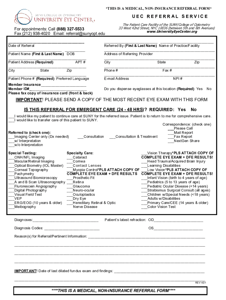 *THIS IS A MEDICAL, COINSURANCE REFERRAL FORM×UEC REFERRAL SERVICE For appointments: Call (888) 3275533 Fax (212) 9384020 Email: referral sunspot. Edith Patient Care Facility of the SUN/College of