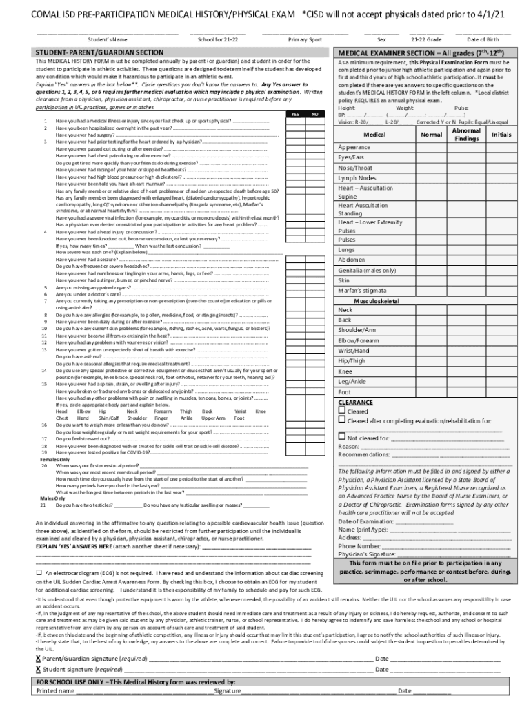 COAL ISD PARTICIPATION MEDICAL HISTORY/PHYSICAL EXAM *CSD will not accept physicals dated prior to 4/1/21 Students Homeschool for 2122Primary SportSex2122 Grade Date of BirthSTUDENTPARENT/GUARDIAN