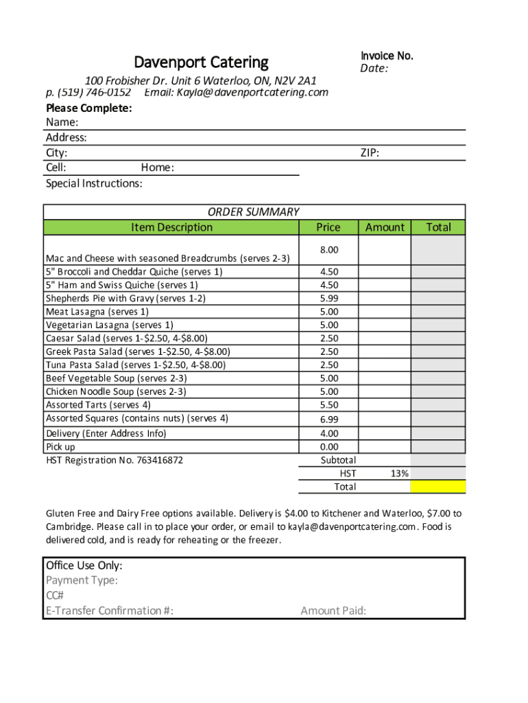 Davenport Catering 100 Frobisher Dr. Unit 6 Waterloo, ON, N2V 2A1 p. (519) 7460152 Email: Kayla davenportcatering.com Please Complete: Name: Address: City: Cell: Home: Special Instructions: ORDER