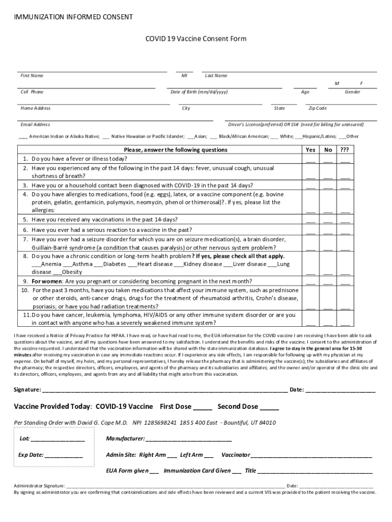 IMMUNIZATION INFORMED CONSENT COVID-19 Vaccine Consent Formalist NameMILast Name Cell Phone Home Addressable of Birth (mm/dd/YYY)AgeCityEmail AddressStateF Gender Code Driver's License(preferred)