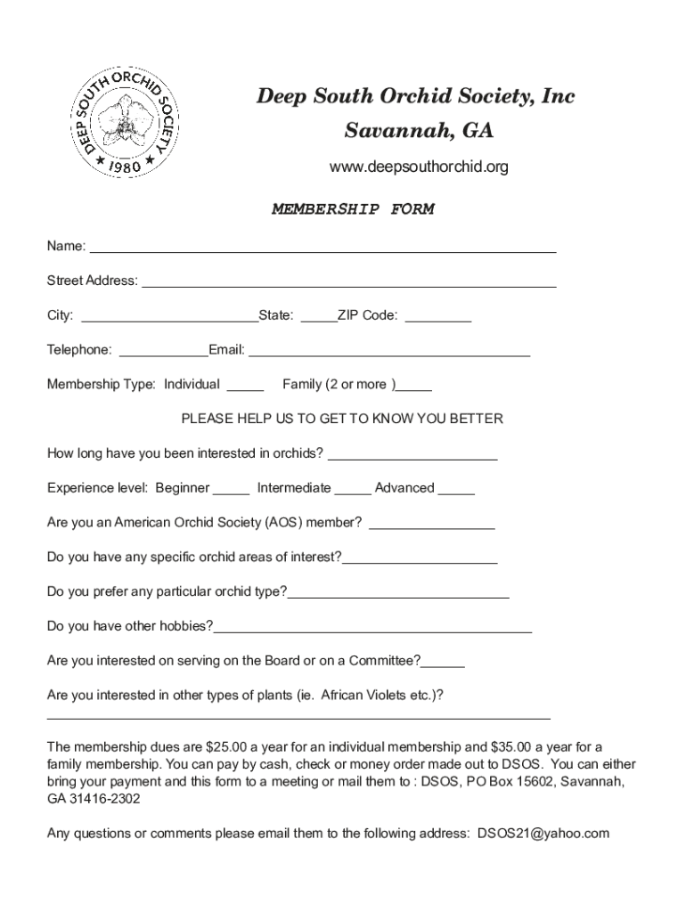 DeepSouthOrchidSociety, Inc Savannah, GA www.deepsouthorchid.orgMEMBERSHIPFORM Name: StreetAddress: City: State: Opcode: Telephone: Email: MembershipType:Individual Family(2ormore) PLEASEHELPUSTOGETTOKNOWYOUBETTER