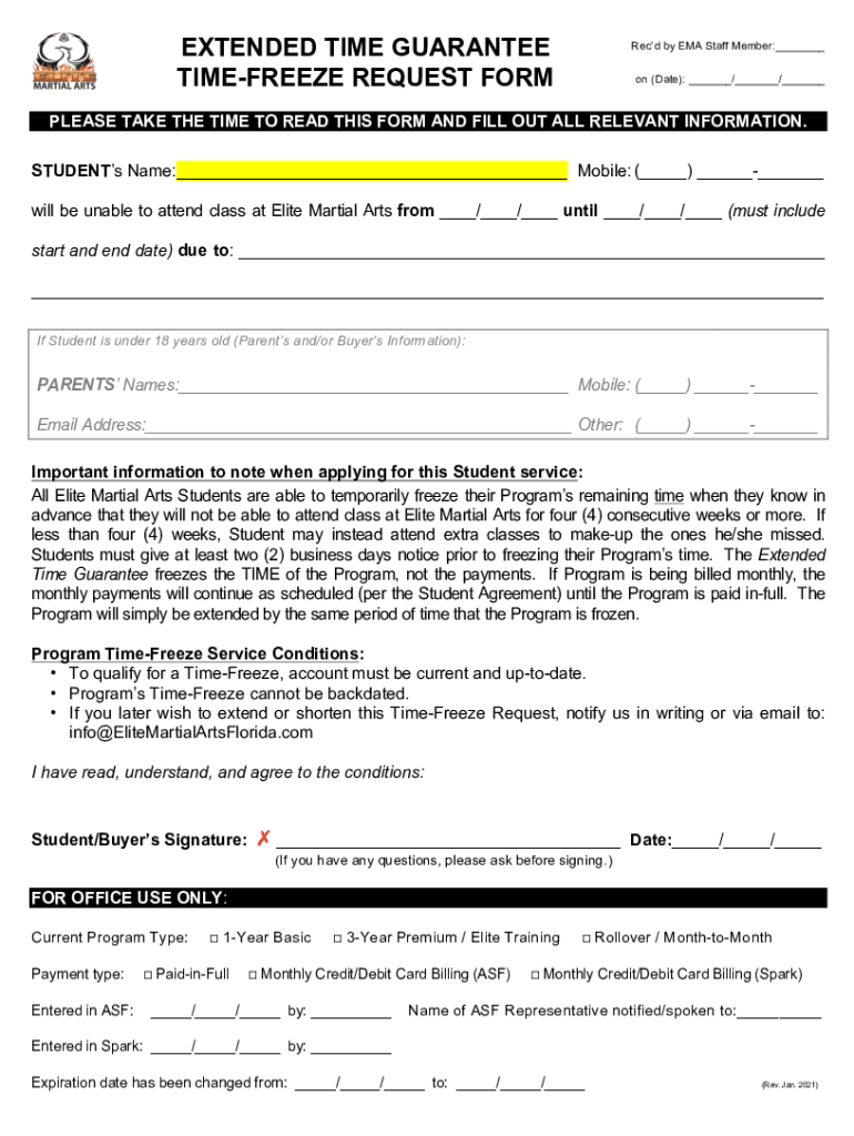 EXTENDED TIME GUARANTEE REFREEZE REQUEST Formed by EMA Staff Member: on (Date): / / PLEASE TAKE THE TIME TO READ THIS FORM AND FILL OUT ALL RELEVANT INFORMATION. Students Name: Mobile: () will be