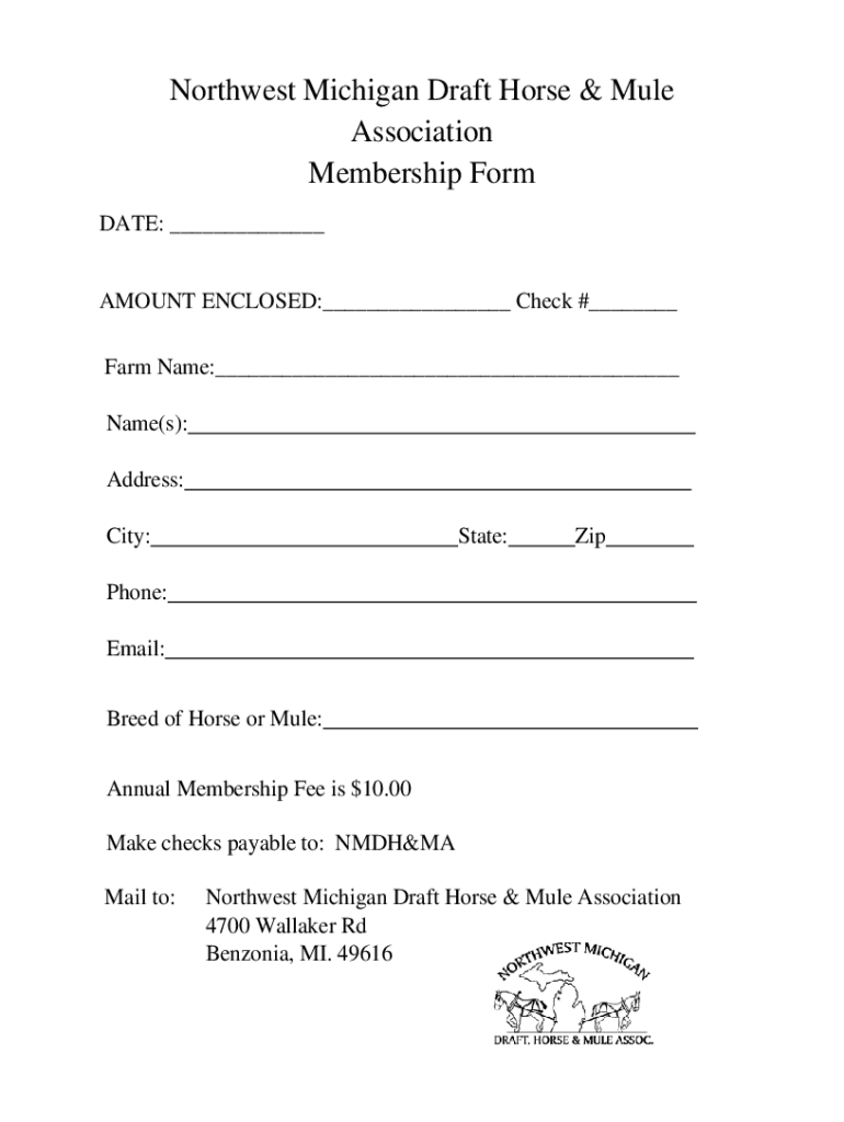Northwest Michigan Draft Horse & Mule Association Membership Form DATE: ___AMOUNT ENCLOSED:___ Check #___ Farm Name:___ Name(s): Address: City:State:iPhone: Email: Breed of Horse or Mule: Annual Membership