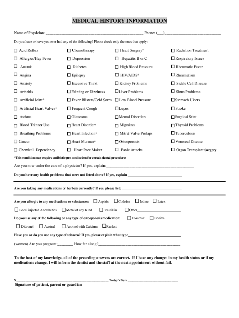 MEDICAL HISTORY INFORMATION Name of Physician: Phone: () Do you have or have you ever had any of the following? Please check only the ones that apply:Acid RefluxChemotherapyAllergies/Hay FeverDepressionAnemiaDiabetesHigh