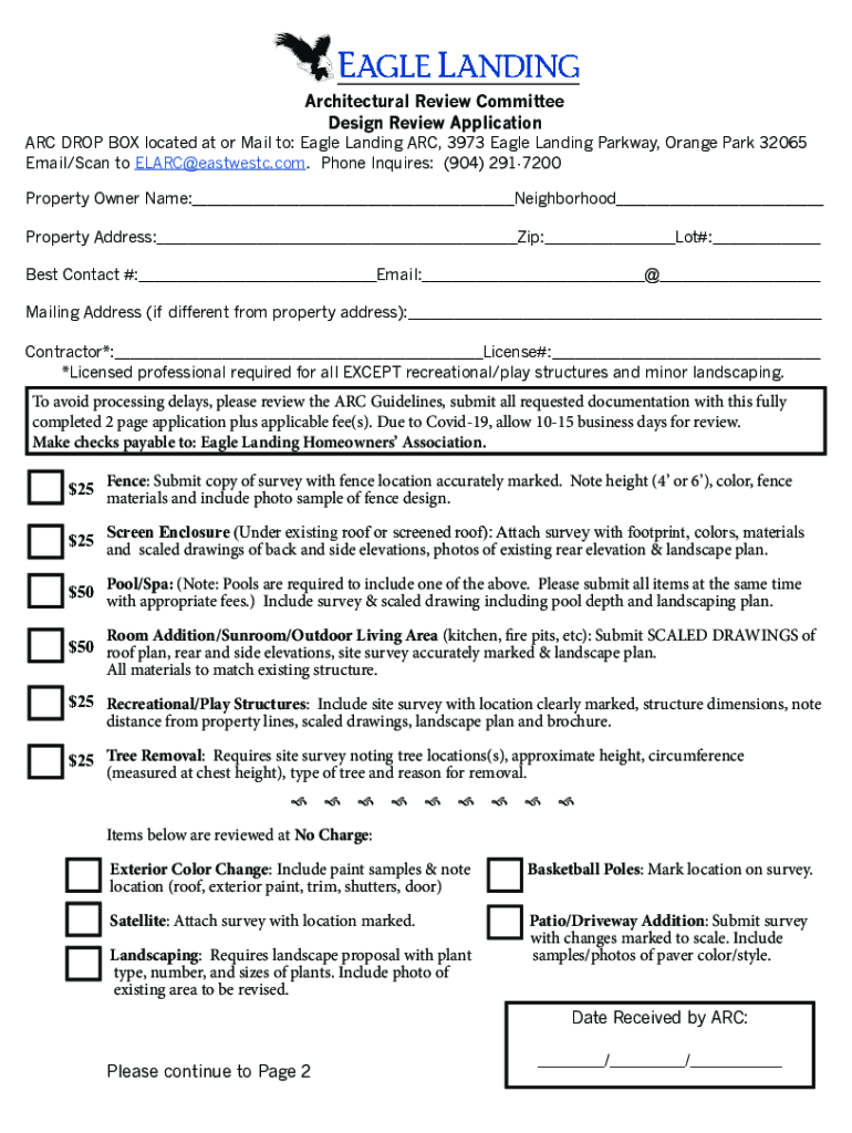 Architectural Review Committee Design Review Application ARC DROP BOX located at or Mail to: Eagle Landing ARC, 3973 Eagle Landing Parkway, Orange Park 32065 Email/Scan to ELA RC eastwestc.com. Phone