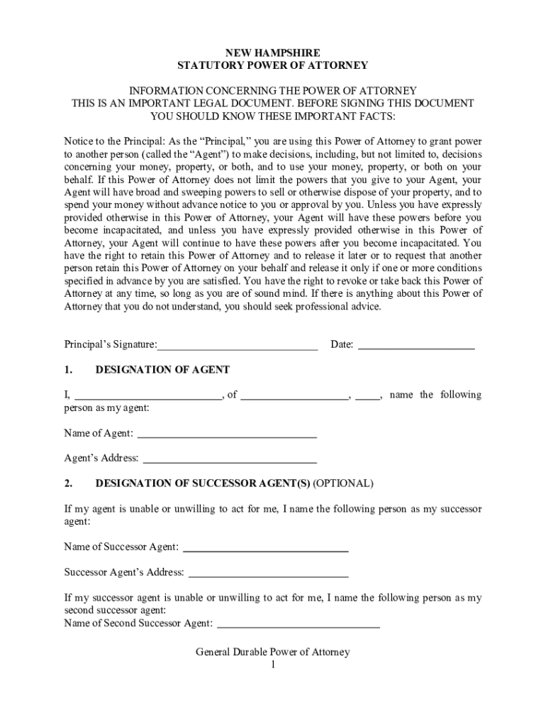 NEW HAMPSHIRE STATUTORY POWER OF ATTORNEY INFORMATION CONCERNING THE POWER OF ATTORNEY THIS IS AN IMPORTANT LEGAL DOCUMENT. BEFORE SIGNING THIS DOCUMENT YOU SHOULD KNOW THESE IMPORTANT FACTS: Notice