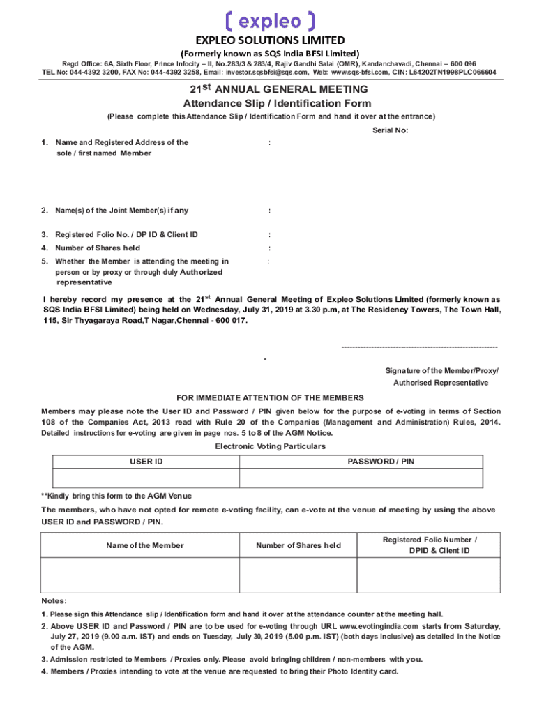 EXILE SOLUTIONS LIMITED (Formerly known as SQS India FSI Limited) Red Office: 6A, Sixth Floor, Prince Info city II, No.283/3 & 283/4, Rajiv Gandhi Salad (OMR), Kandanchavadi, Chennai 600 096 TEL No: