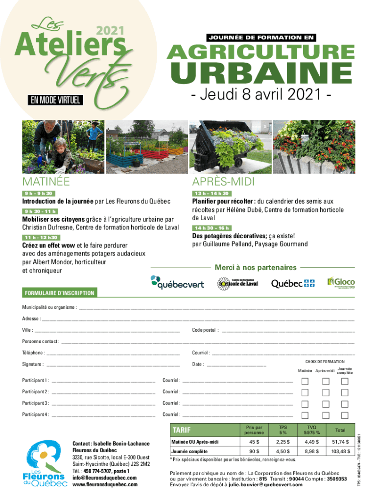 JOURNEY DE FORMATION ENAGRICULTUREURBAINE Jedi 8 April 2021 EN MODE VIRTUELMATINEAPRSMIDI9 h 9 h 3013 h 14 h 30Introduction de la journey par Les Neurons du Quebec 9 h 30 11 mobilizer SES citizens