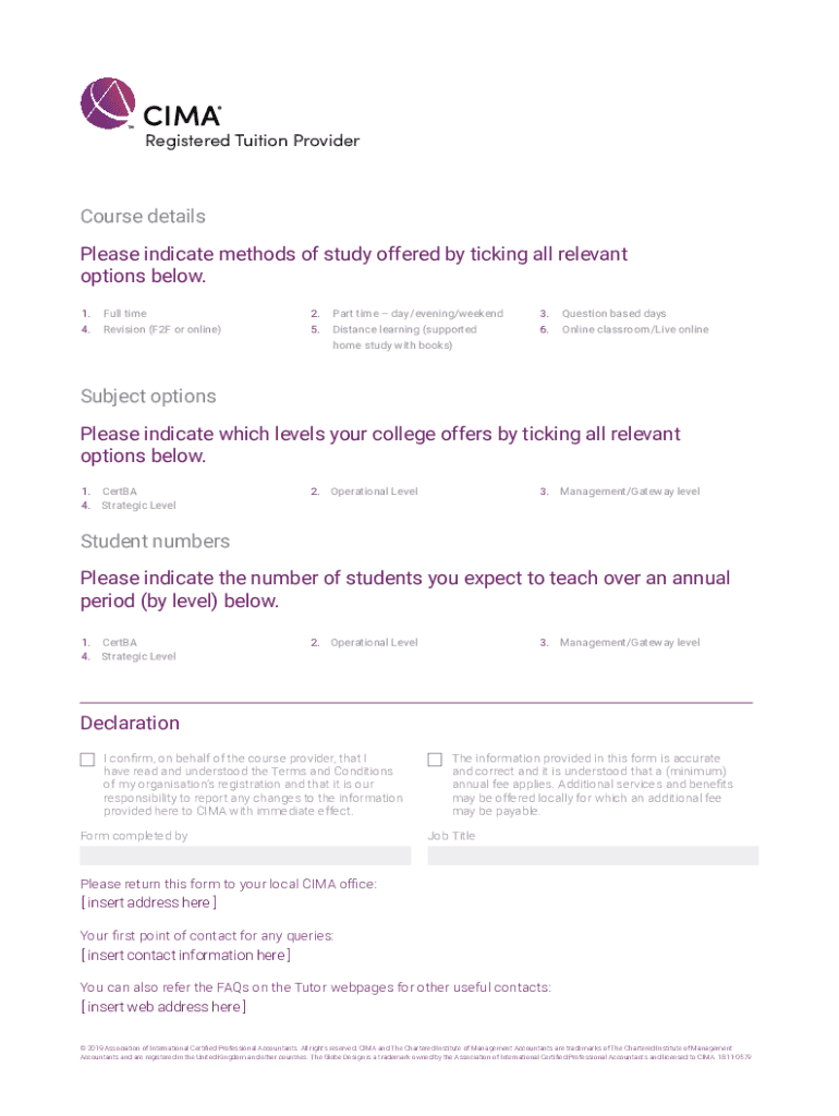 Registered Tuition ProviderApplication Form for Registered CIA Tuition Providers 2020 Registration Fee: 200 per annum. Following submission of your application, the details provided below* will appear