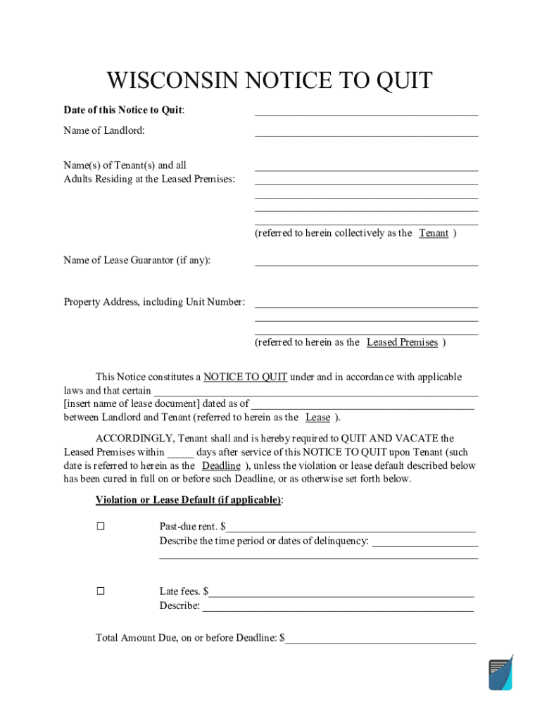 WISCONSIN NOTICE TO QUIT Date of this Notice to Quit: Name of Landlord: Name(s) of Tenant(s) and all Adults Residing at the Leased Premises: (referred to herein collectively as the Tenant)Name of