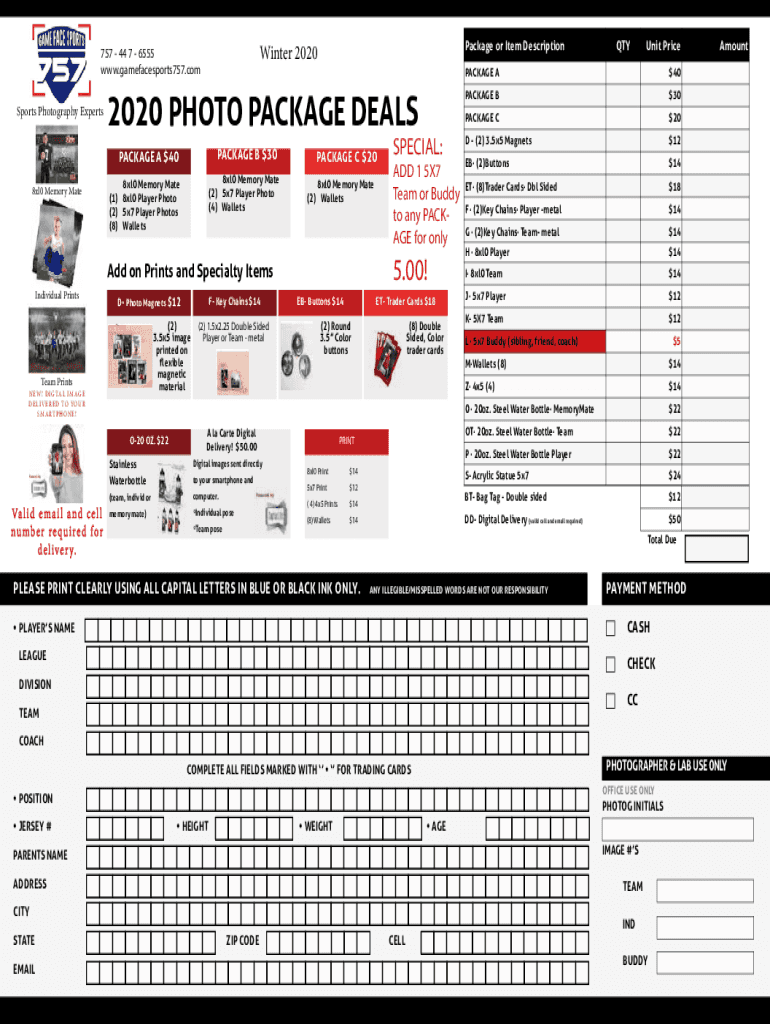 Sports Photography Experts2020 PHOTO PACKAGE DEALS PACKAGE B $30PACKAGE A $408xl0 Memory Mate (2)5×7 Player Photo (4) Wallets8xl0 Memory Mate (1) 8xl0 Player Photo (2)5×7 Player Photos (8)Wallets8xl0