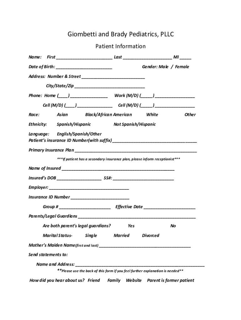Giacometti and Brady Pediatrics, PLLCPatient Informational:First Last MI Date of Birth: Gender: Male/FemaleAddress:Number & Street City/State/Zip Phone:Home () Work (M/D) () Cell (M/D) () Cell (M/D)