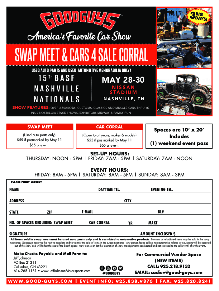 TMS WAP MEET & CARS 4 SALE CORRAL USED AUTO PARTS AND USED AUTOMOTIVE MEMORABILIA ONLY!MAY 28301 5 TH B A S F NASHVILLE NATIONALSNISSAN S TA D I U NASHVILLE, SHOW FEATURES: OVER 2,500 RODS, CUSTOMS,